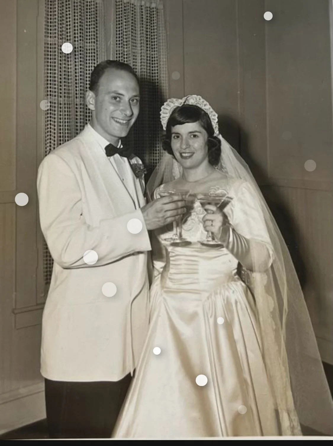 Yesterday, I came across a photograph of my parents on their wedding day, radiant and full of promise. I took a picture of it on my phone to preserve it. When I looked at it again today to show a dear friend, something extraordinary happened. The image seemed alive. Delicate orbs of light appeared and began to shimmer, one by one, as if dancing across the photo.